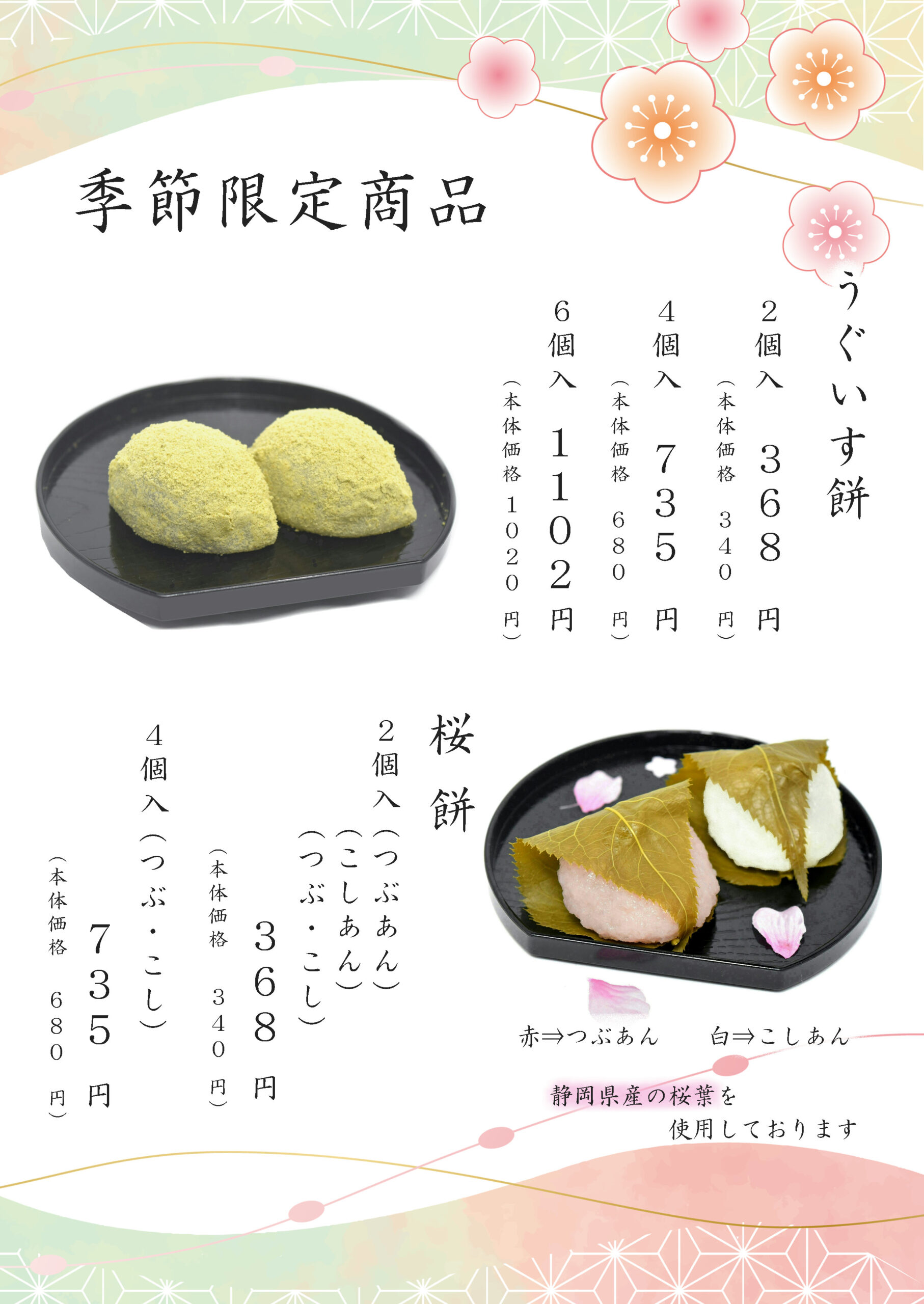 季節限定商品「うぐいす餅」「桜餅」販売中【3月9日頃まで予定】