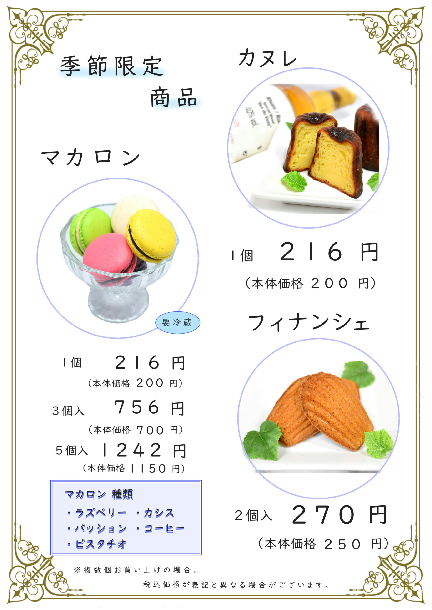 季節限定商品「カヌレ」「フィナンシェ」「マカロン」